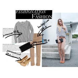 Ďalej tu síce nemáme celebritu ale aj tak sa táto žena podľa nás obliekla veľmi pekne a preto sme sa rozhodli outfit zostaviť podrobnejšie.Outfit tejto ženy tvorí veľa vecí zo známych internetových obchodov. Spodok outfitu je veľmi jednoduchý ladený do bežovej možno že až slabunko hnedej farby.Vrchom outfitu je pasikavé tričko s dlhými rukávmi.A posledný kúsok je dominantná čierna vybívaná listová kabelka.