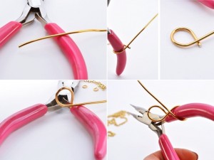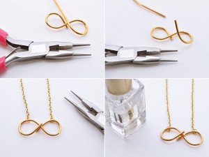 Vezmite si kúsok drôtiku a postupne ho začnite tvarovať. Pomôžu vám v tom kliešte, alebo čokoľvek okrúhle. Drôtik omotajte okolo nožičky a vznikne vám prvá slučka. Druhú vytvorte rovnakým spôsobom a zvyšok odstrihnite.Ostrihnuté konce zatlačte čo najviac k sebe, aby vytvorili ležatú osmičku. Spojovacími krúžkami pripevnite retiazku k prívesku. Nakoniec na spoje uprostred naneste kvapku bezfarebného laku, ktorý ich zafixuje a zahladí.